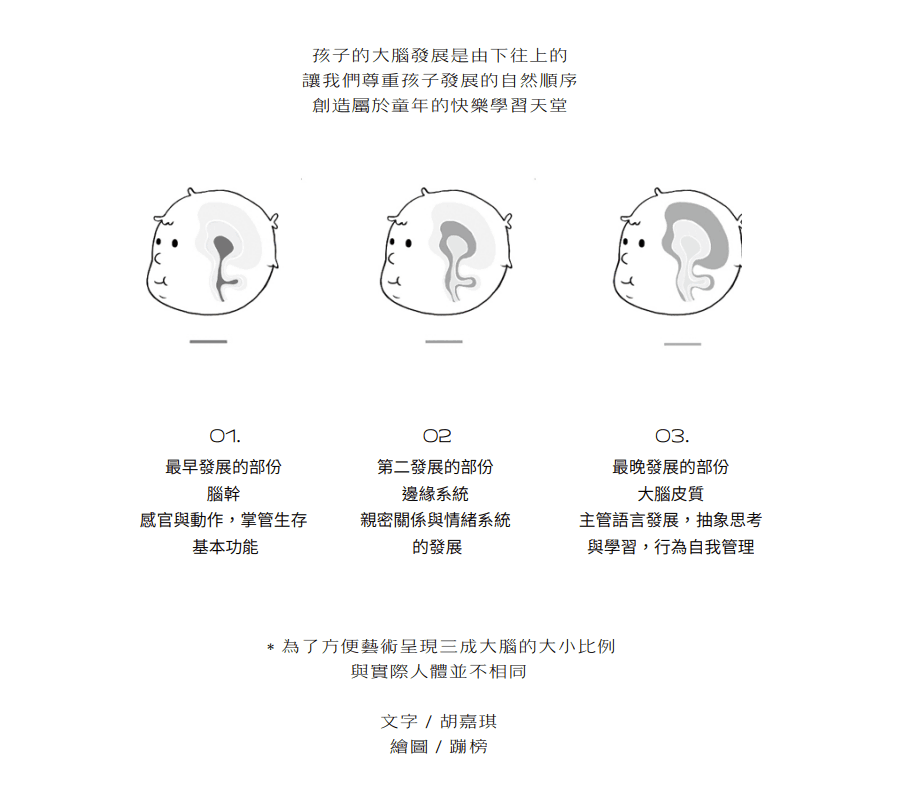 你知道嗎?小寶寶剛出生的時候其實看不太清楚也聽不太清楚,舌頭上的味覺也還沒有發展完全。就像這張圖所顯示的,在小寶寶剛出生後的前幾年,身體吸收的養分,都會拿來建設負責基本生存功能的「腦幹」,以及負責跟爸媽建立親密關係的「邊緣系統」。